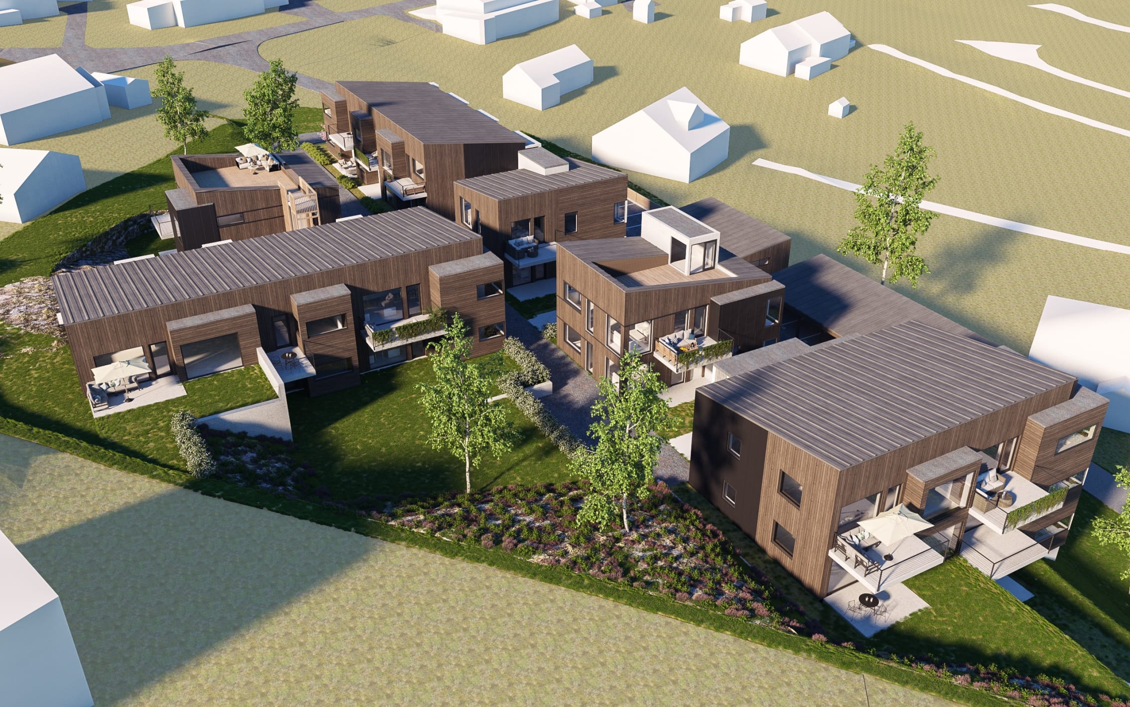 Fasadene bygges opp som isolerte bindingsverksvegger med tre kledning – malt med to strøk. På mindre deler av fasade kan andre materialer benyttes.